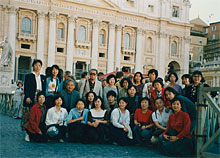 10月6日(水)午前、オリンピック航空で、来年の2000年・聖年に沸くローマのフィウミチーノ空港に到着。第三回渡欧演奏旅行から16年、今回もイタリア全てを同行、お世話して頂いたローマ在住テノール歌手の安廣さん、そして近畿日本ツーリストの添乗員、中村さんに迎えられてレストランへ昼食をとりに向かう。ギリシャ料理もおいしくいただきましたが、久しぶりのイタリア料理が何とおいしく感じたことか!そして、いよいよ世界のカトリック教会の総本山サン・ピエトロ寺院へ。私自身、3度目の演奏旅行でしたが、前回2度とも工事中で見学できなかったバチカン美術館とシスティーナ礼拝堂に初めて入ることができました。貴重な美術品が集まるローマの美術館の中でも、群を抜くバチカン美術館。バチカン宮殿の大部分がそのまま展示スペースになっているため内部は広く、安廣さんの説明を聞き、美術品に見とれて、遅れずについていくのが必死でした。見学者がとても多く、システィーナ礼拝堂では少しさわがしくなると、どこからか「シー!」という声が聞こえ、改めて、神聖な場所であることを感じさせられました。圧倒的な色彩と構図のフレスコ画に囲まれると、まさに打ちのめされるという感じがしました。サン・ピエトロ寺院に入ると、五つの扉がありますが、右端の扉は25年に一度の聖年の年のみ開かれる扉で、来年がその年に当たるため一部修復工事を行っていました。中に入り、大好きなピエタの像に再開できたのは感激でしたが、心ない人たちを防ぐためにロープが張られ、以前のように近くで見ることができず、とても残念でした。
